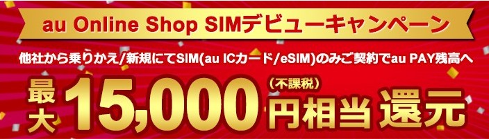 キャンペーン期間中にau Online Shopから、他社からの乗り換えでSIMのみauに乗り換える場合、15,000円相当(不課税)がau PAY残高還元されます。