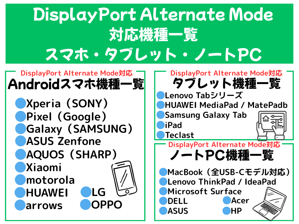 DisplayPort Alternate Mode対応機種一覧|スマホ・タブレット・ノートPC