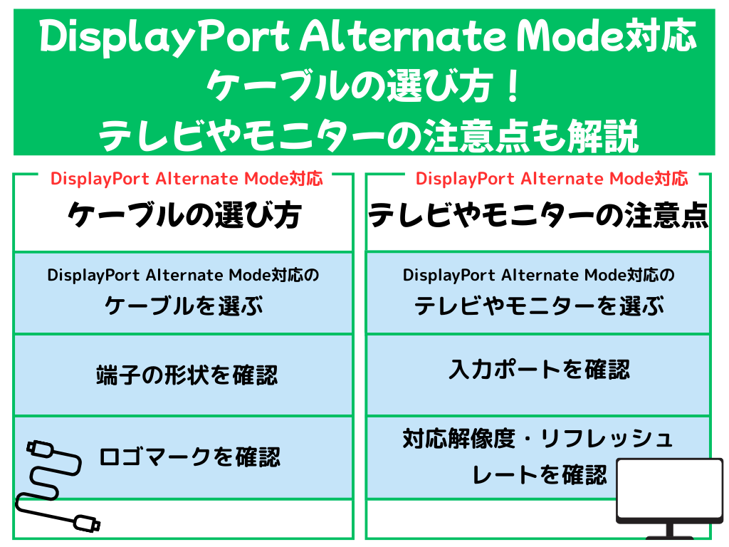 DisplayPort Alternate Mode対応のテレビやモニターを選ぶ際は、Alt Mode対応の有無・入力ポート・解像度やリフレッシュレートの3つの確認が必要です。