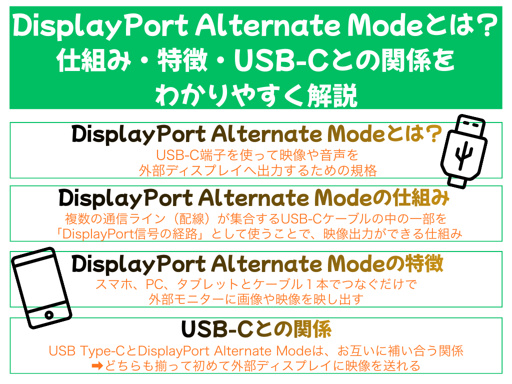 DisplayPort Alternate Modeの概要については、後のパート「DisplayPort Alternate Modeとは?仕組み・特徴・USB-Cとの関係をわかりやすく解説」で解説しています。