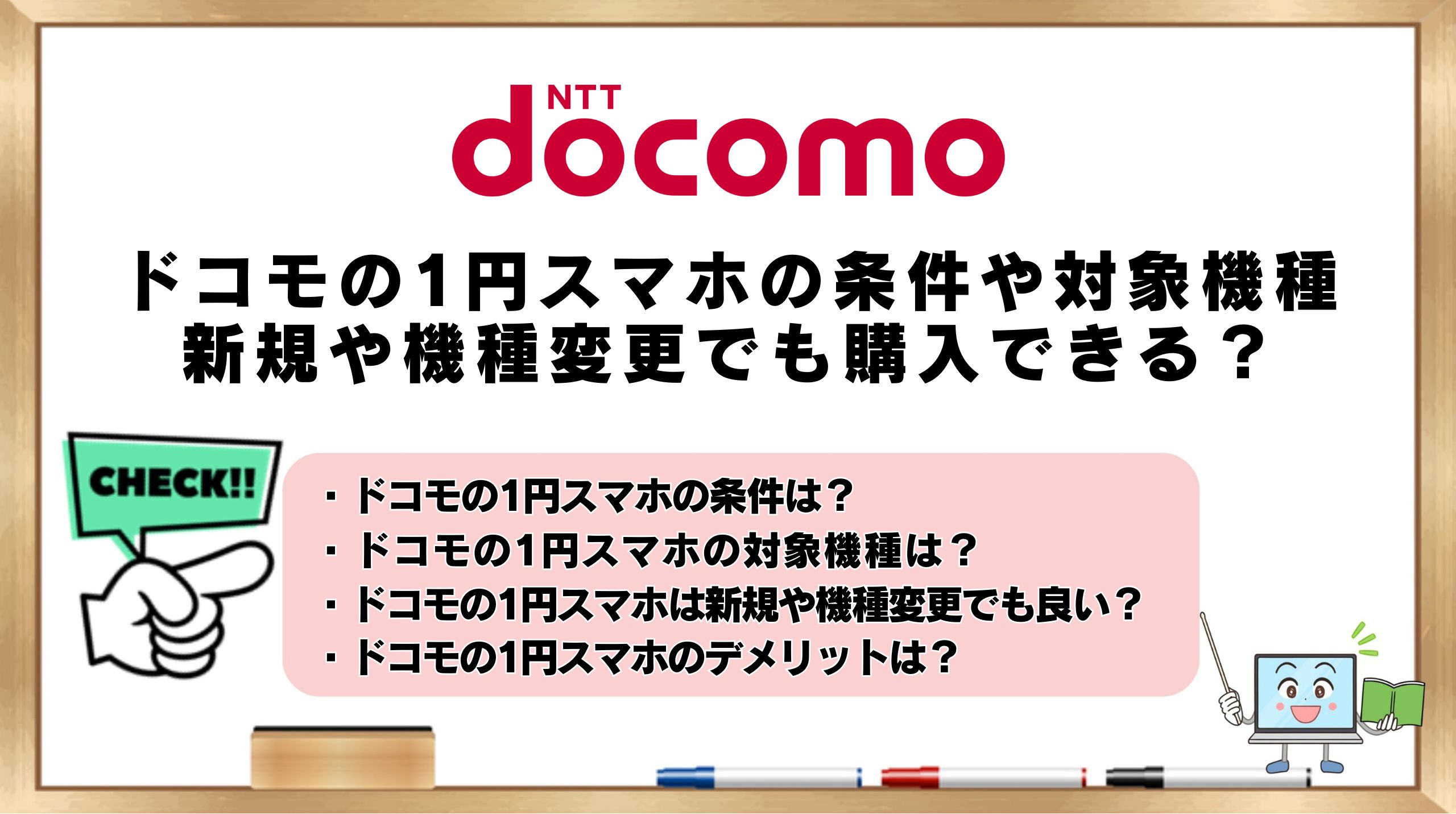 ドコモの1円スマホは、選ぶ機種や契約方法によって対象になる場合とならない場合があり、情報を整理しないと判断しにくいです。