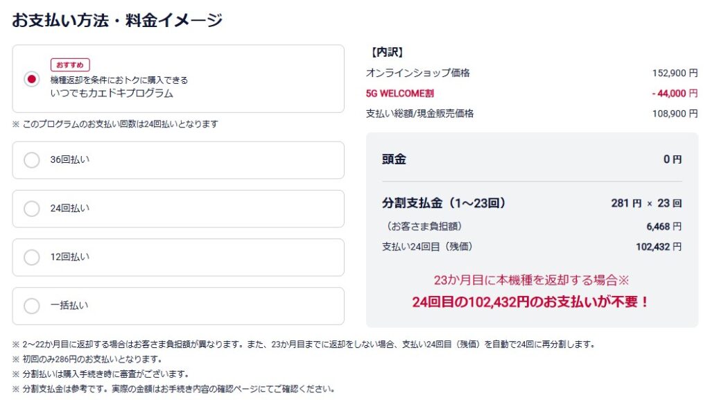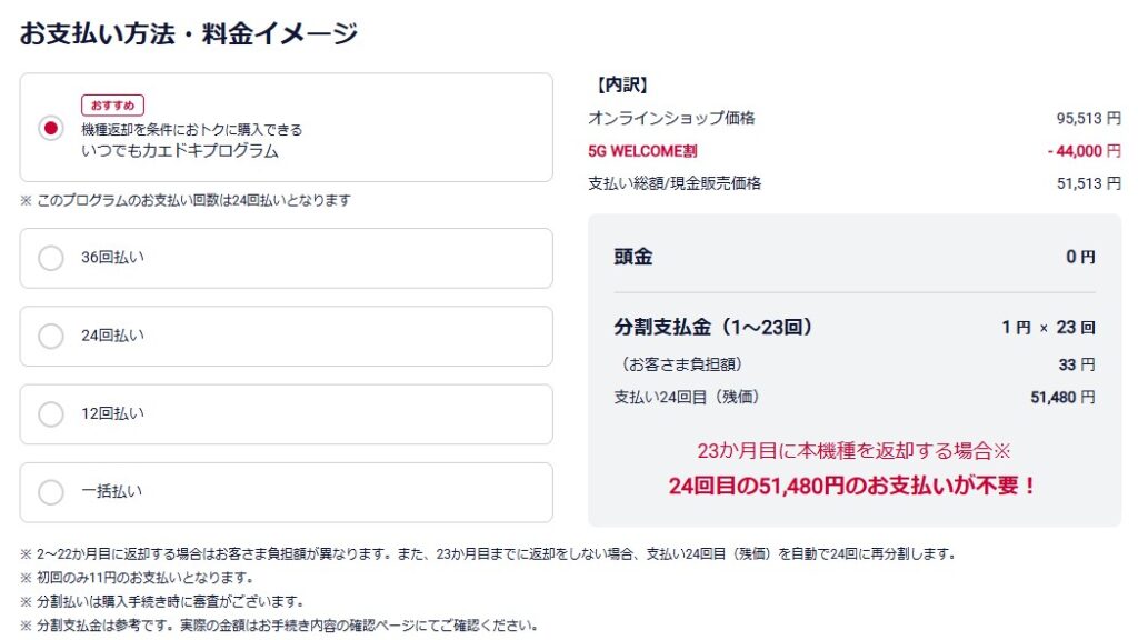 - 機種代金を選ぶ際に「いつでもカエドキプログラム」の分割払いを選ぶ