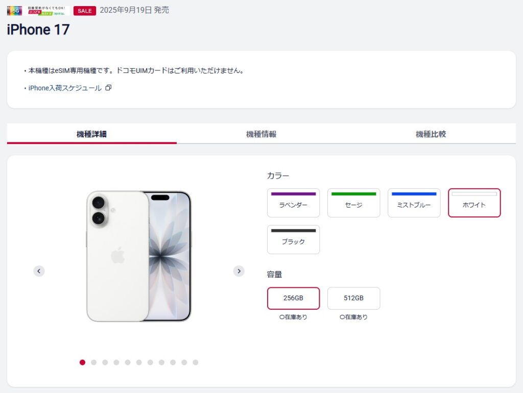 上の画像はドコモで販売されているいつでもカエドキプログラムの対象機種、iPhone17(256GB)とGoogle pixel 9a(128GB)です。