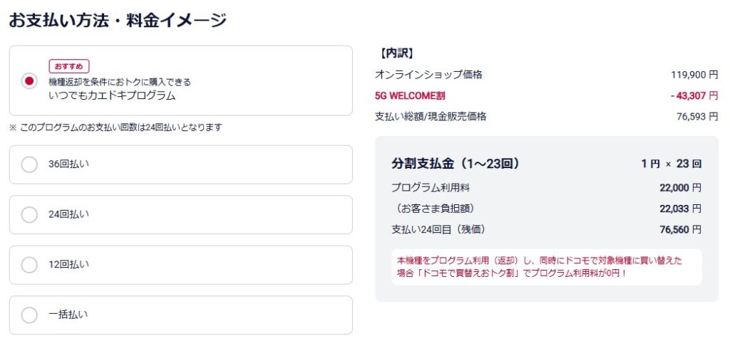 通常のいつでもカエドキプログラムは、対象機種を残価設定型24回払いで購入し、23か月目までに返却すると24回目の残価の支払いが不要になります。