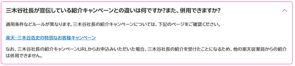 また、三木谷社長による紹介のため、前のところで解説した他の紹介キャンペーン(「Rakuten最強プラン紹介キャンペーン(利用者の紹介)」「従業員紹介キャンペーン」)より適用の優先度が高いこともうなづけます。