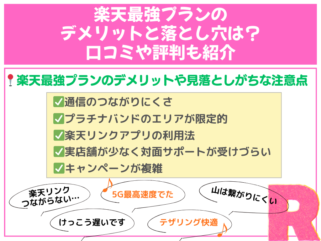 この章では、楽天最強プランのデメリットや、見落としがちな注意点について、実際の口コミや評判をあわせ解説します。