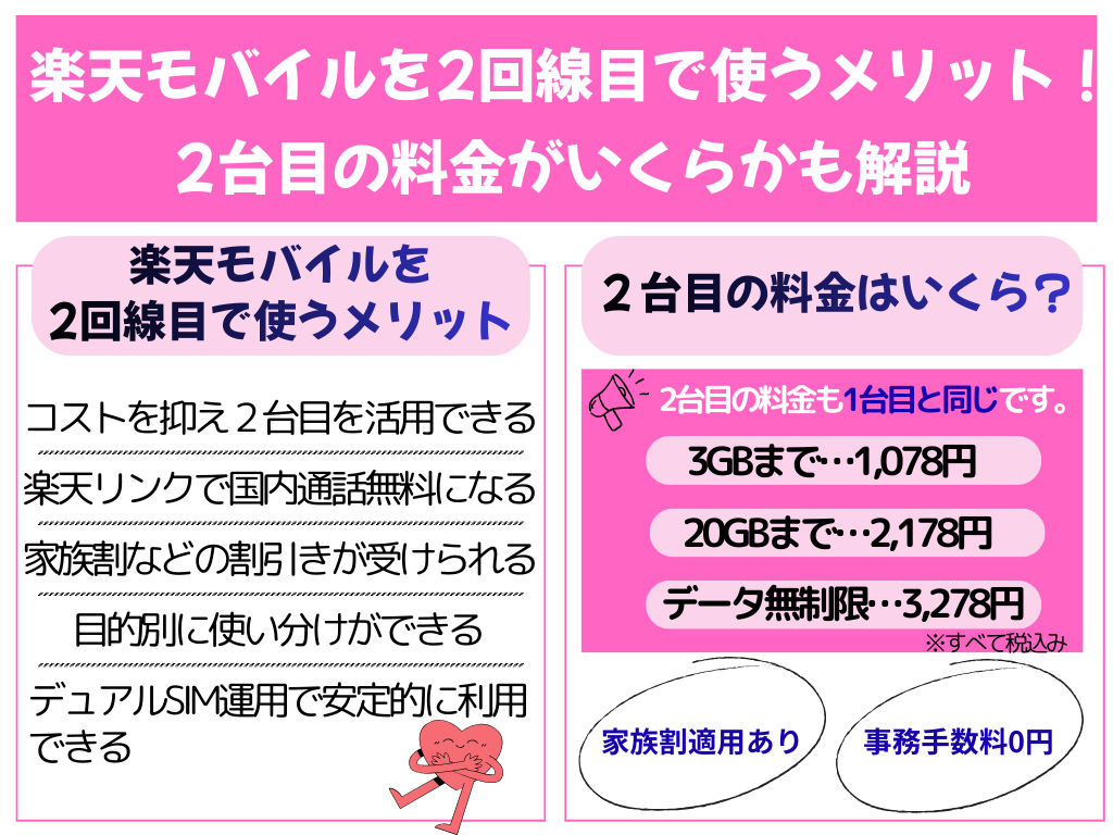 この章では、楽天モバイルの2回線目を使うメリットや、2台目の料金について解説します。