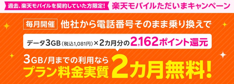 | 三木谷キャンペーン | 最大14,000ポイント | 新規・乗り換え ※三木谷キャンペーンの利用がはじめてなら2回線目や再契約も可 | 条件がゆるく、常時開催。初めての申し込みに最適。 |