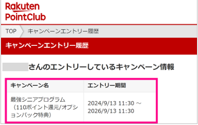 - エントリーの確認⇒楽天PointClub(楽天のポイント管理アプリ・サイト)