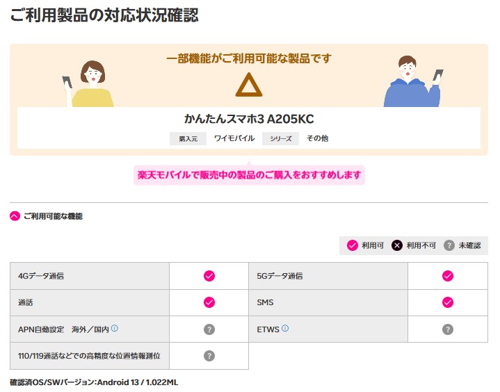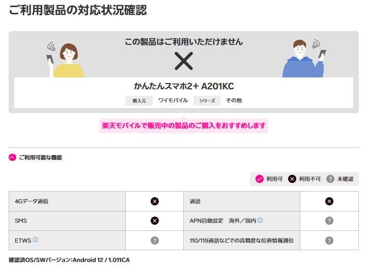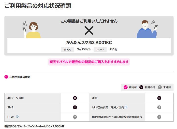 まず、かんたんスマホ2(A001KC)や旧モデルは、楽天モバイルの動作確認でも「利用不可」とされており、通話やデータ通信などの基本的な機能が正常に使えません。