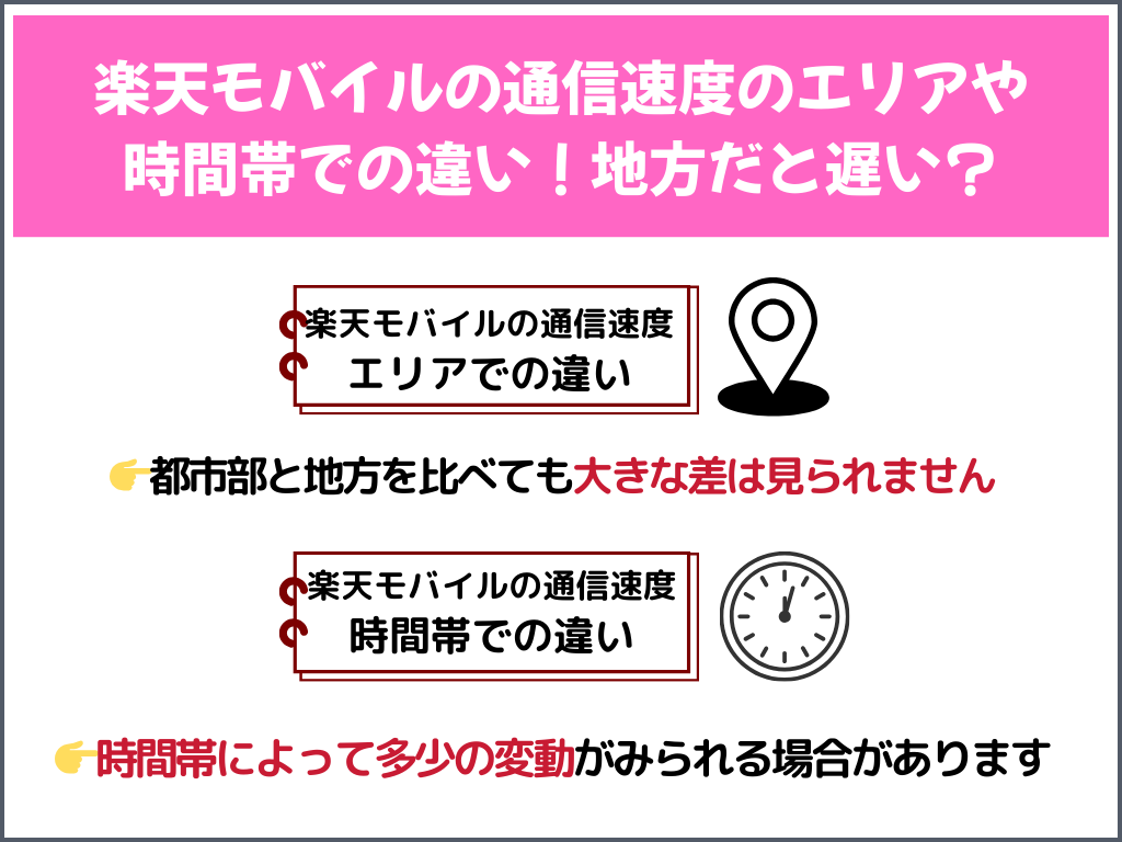 この章では、楽天モバイルの通信速度はエリアや時間帯で違いがあるのか、また、地方だと遅いのかについて解説します。