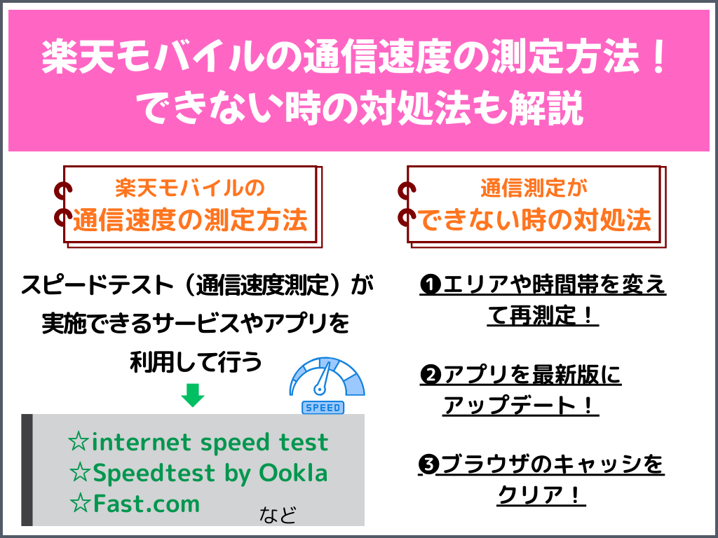 そこでこの記事では、楽天モバイルの通信速度の測定方法や、できない時の対処法についても解説していきます。