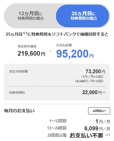 しかも、25ヶ月目や13ヶ月目に特典利用申し込みと利用していた端末を返却すると、その月以降の支払いが不要になります。