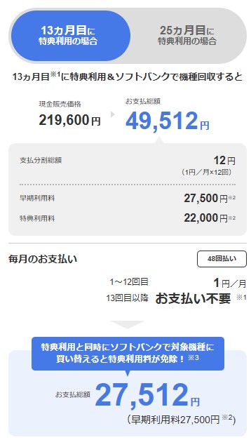 さらに、13ヶ月目で特典申し込みをして対象機種に機種変更すれば、支払い総額が27,512円まで安くなるので、常に最新機種を使いたい方には、お得なサービスと言えます。