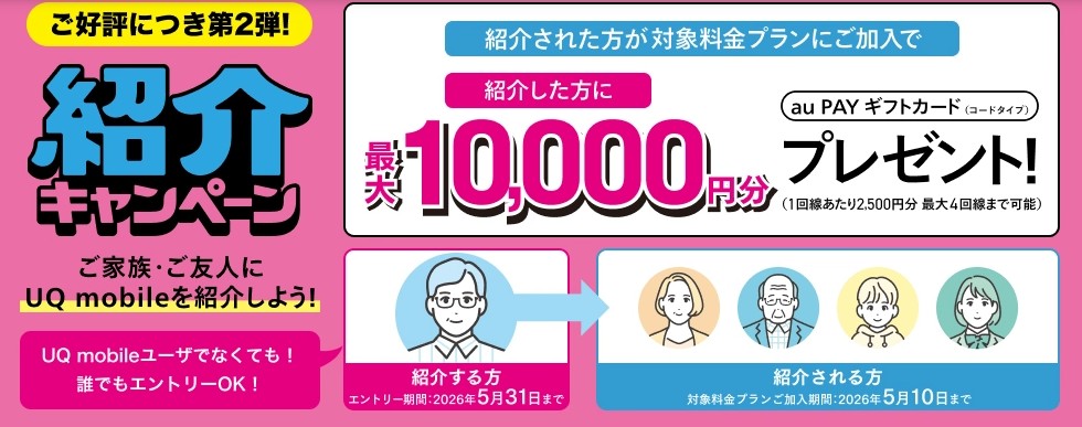 このキャンペーンは、UQモバイルのオンラインショップでSIMのみまたは対象機種を新規契約し、コミコミプランバリューまたはトクトクプラン2に入り、増量オプションⅡへ加入したうえで、家族セット割または自宅セット割に新規加入すると、最大10,000円相当(不課税)のau PAY残高が還元される内容です。