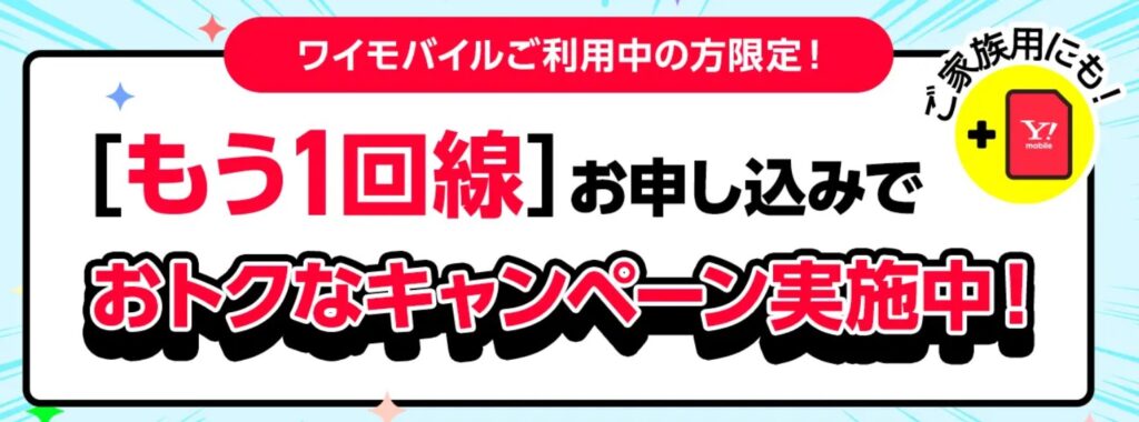 「契約者限定:追加回線(もう1回線)特典」は、ワイモバイルをすでに契約している人が、家族用や2台目としてもう1回線を追加する場合に使えるキャンペーンです。