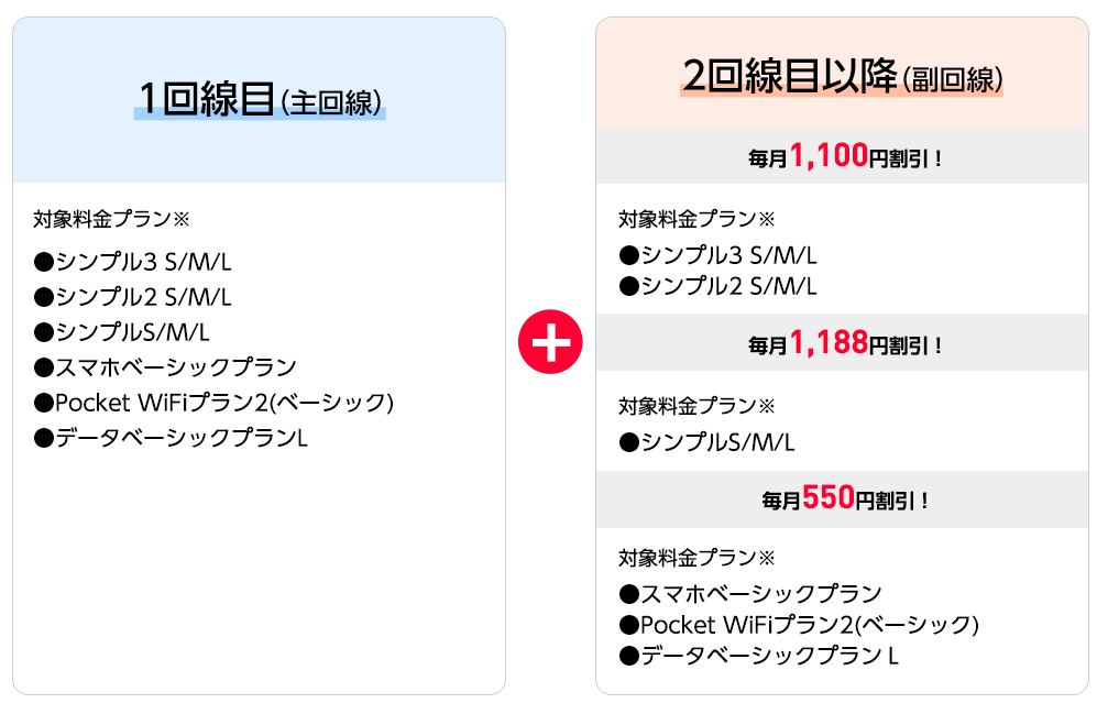 - 家族割の金額:2回線目から月1,100円割引(最大9回線)※1回線目は割引なし