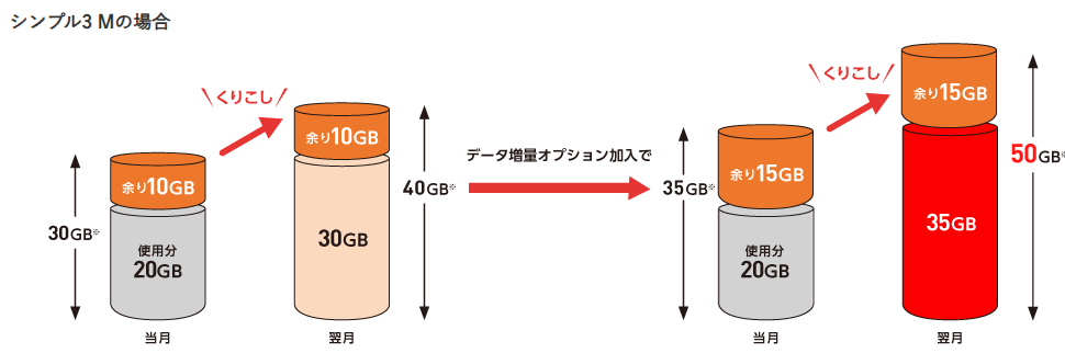 - データ増量オプション加入時のくりこし:翌月加入プランのデータ容量(データ増量オプションによる増量分まで)