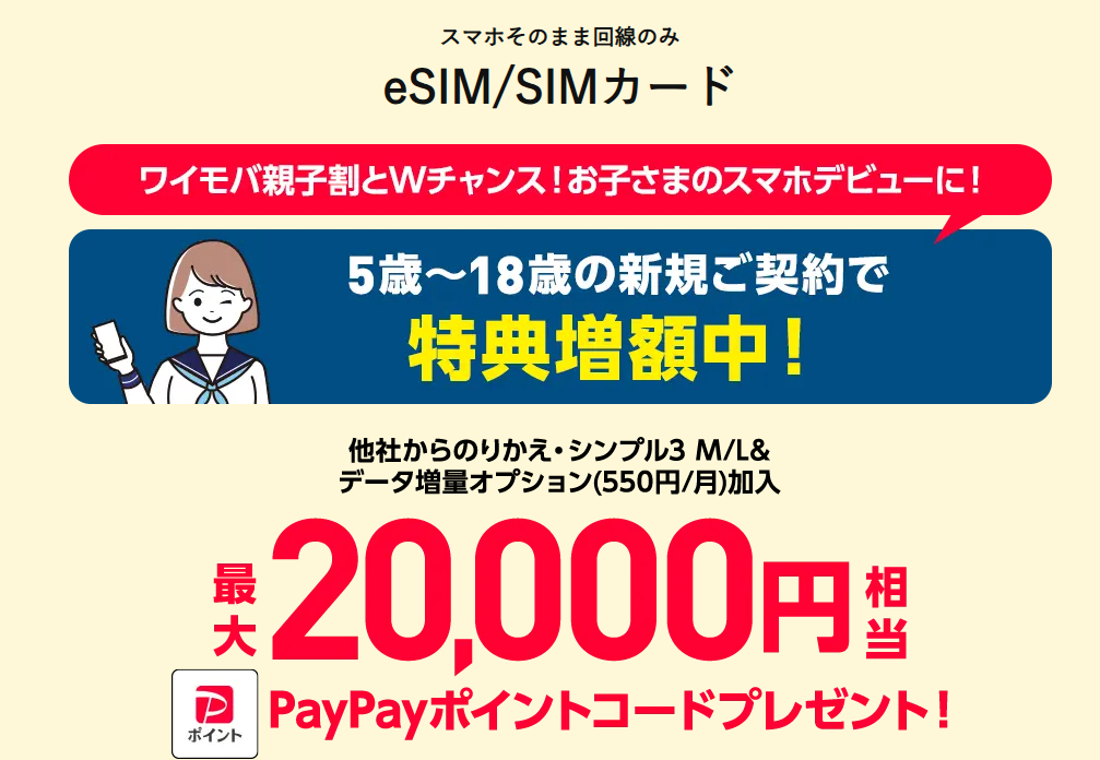 他社からワイモバイルに乗り換えるか、5~18歳の方が新規契約する場合、最大20,000円相当のPayPayポイントがもらえるキャンペーンが開催中です!